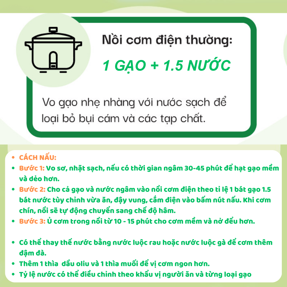 – Ngon hơn khi đổ nước, để khoảng 15-20 phút mới cắm điện nấu cơm như bình thường hoặc thêm 1 chút dầu oliu